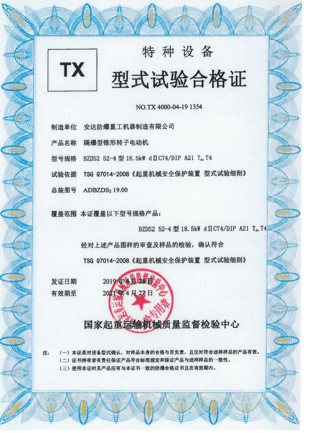 » 隔爆型錐形轉子電動機 TX型式試驗合格證