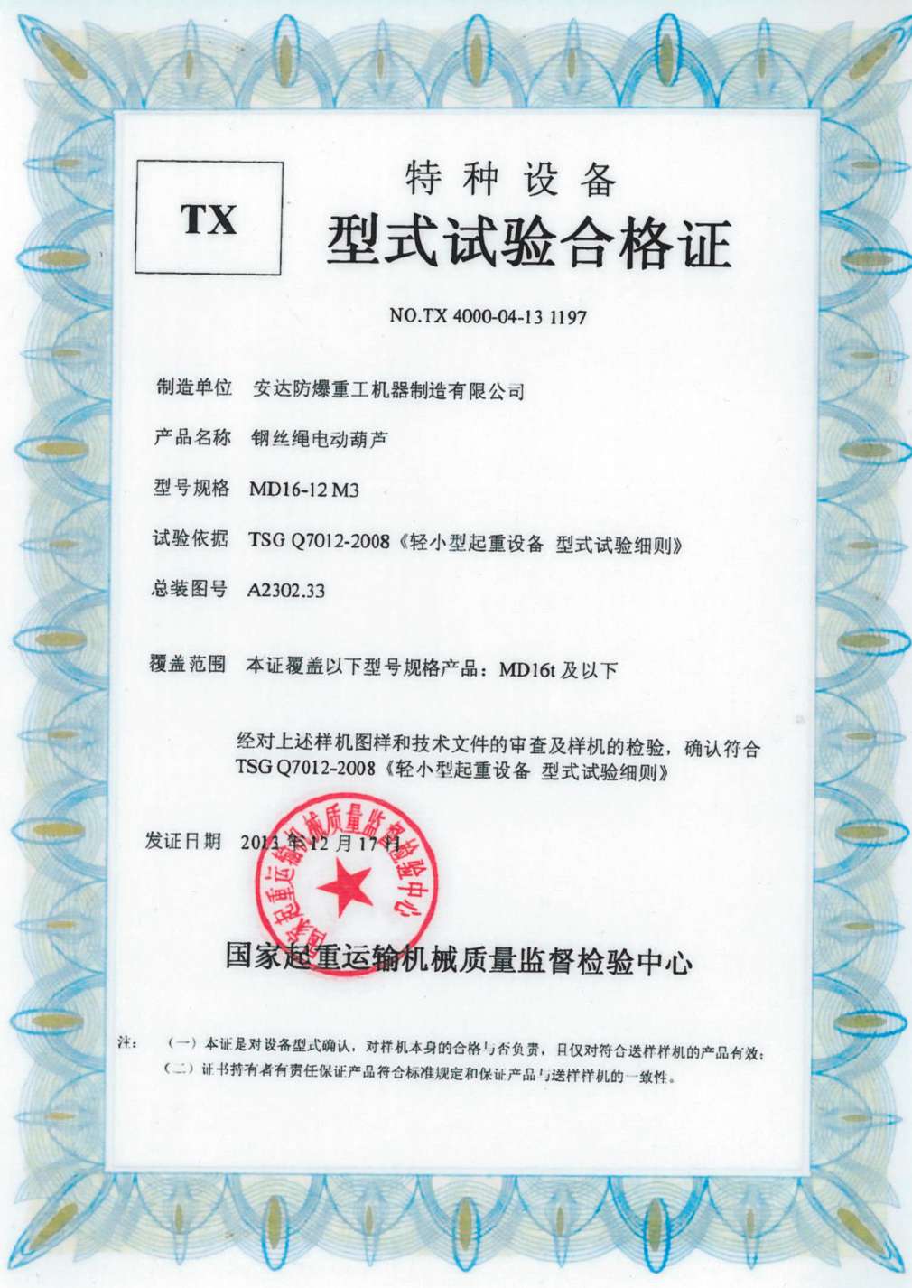 鋼絲繩電動葫蘆 TX型式試驗合格證