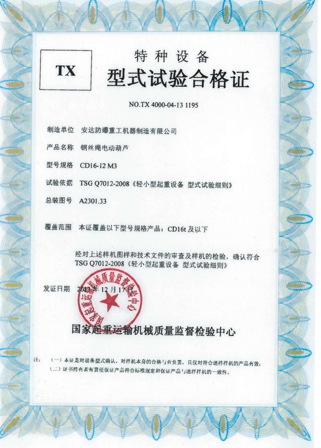 鋼絲繩電動葫蘆 TX型式試驗合格證