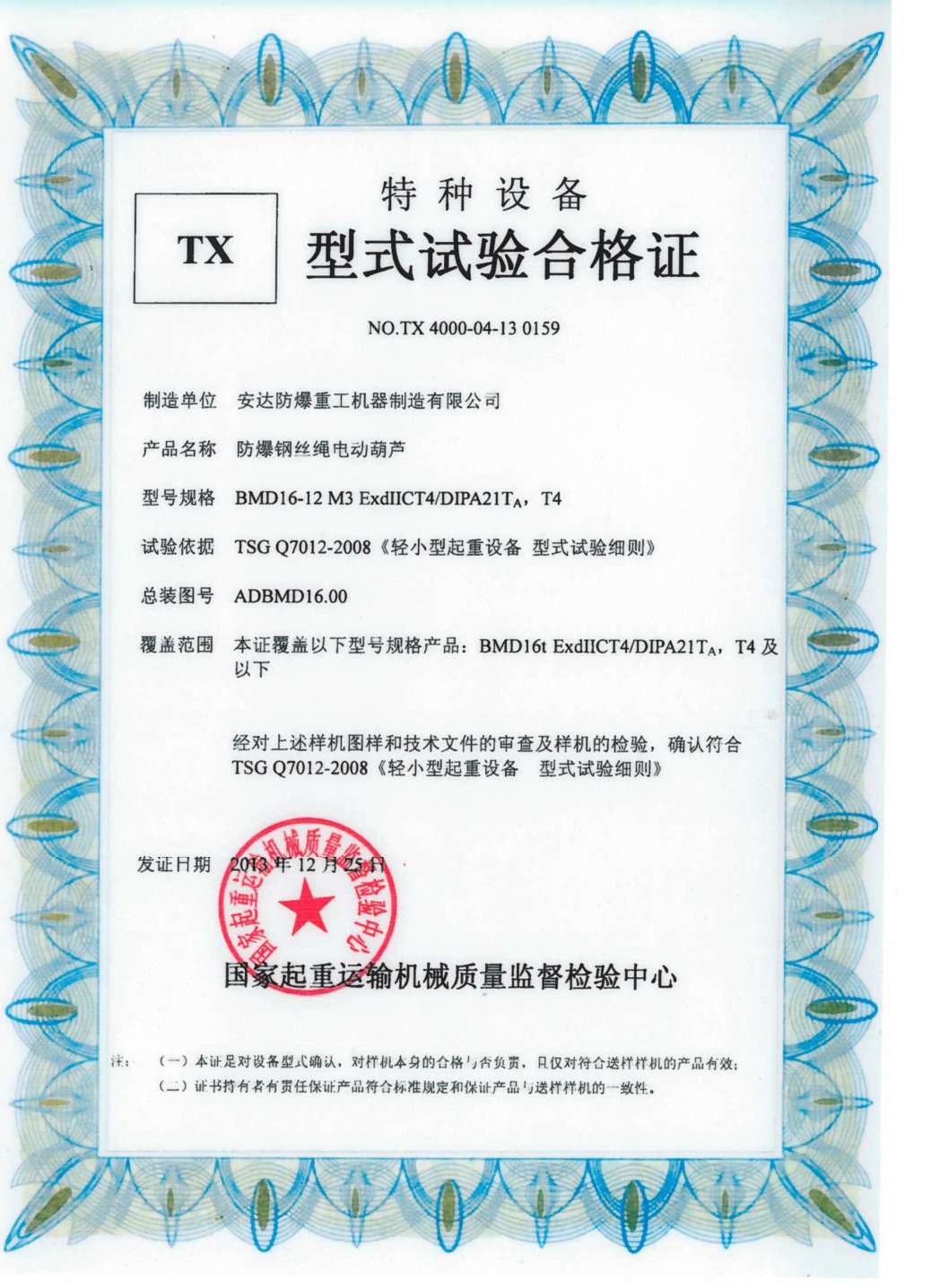 防爆鋼絲繩電動葫蘆 TX型式試驗合格證