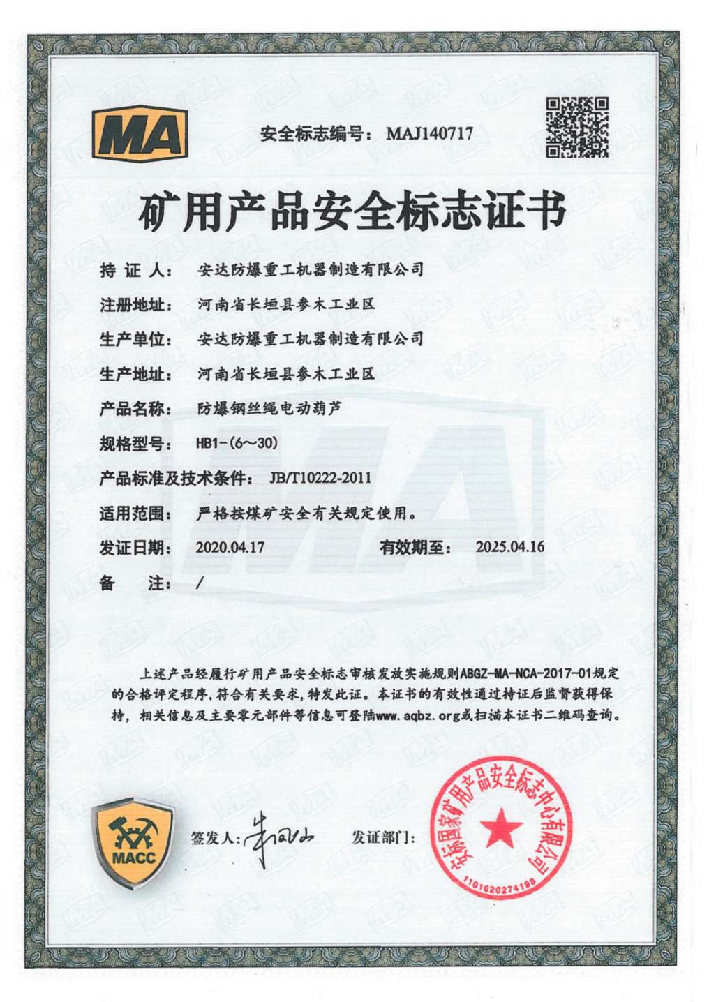 | 發(fā)證機(jī)構(gòu): | 安標(biāo)國(guó)家礦用產(chǎn)品安全標(biāo)志中心有限公司 | 發(fā)證時(shí)間 : | 2020-04-17 |