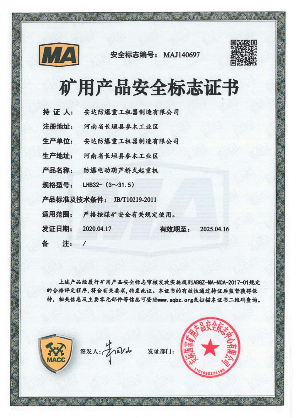 | 發(fā)證機構(gòu): | 安標(biāo)國家礦用產(chǎn)品安全標(biāo)志中心有限公司 | 發(fā)證時間 : | 2020-04-17 |