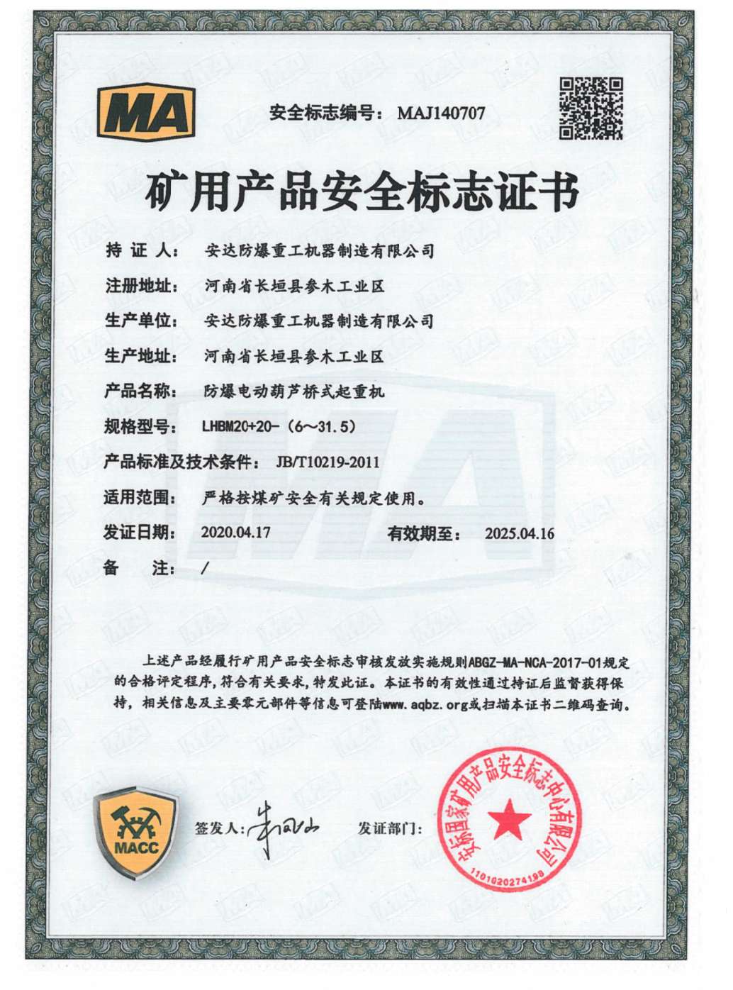 防爆鋼絲繩葫蘆橋式起重機 礦用產品安全標志證書