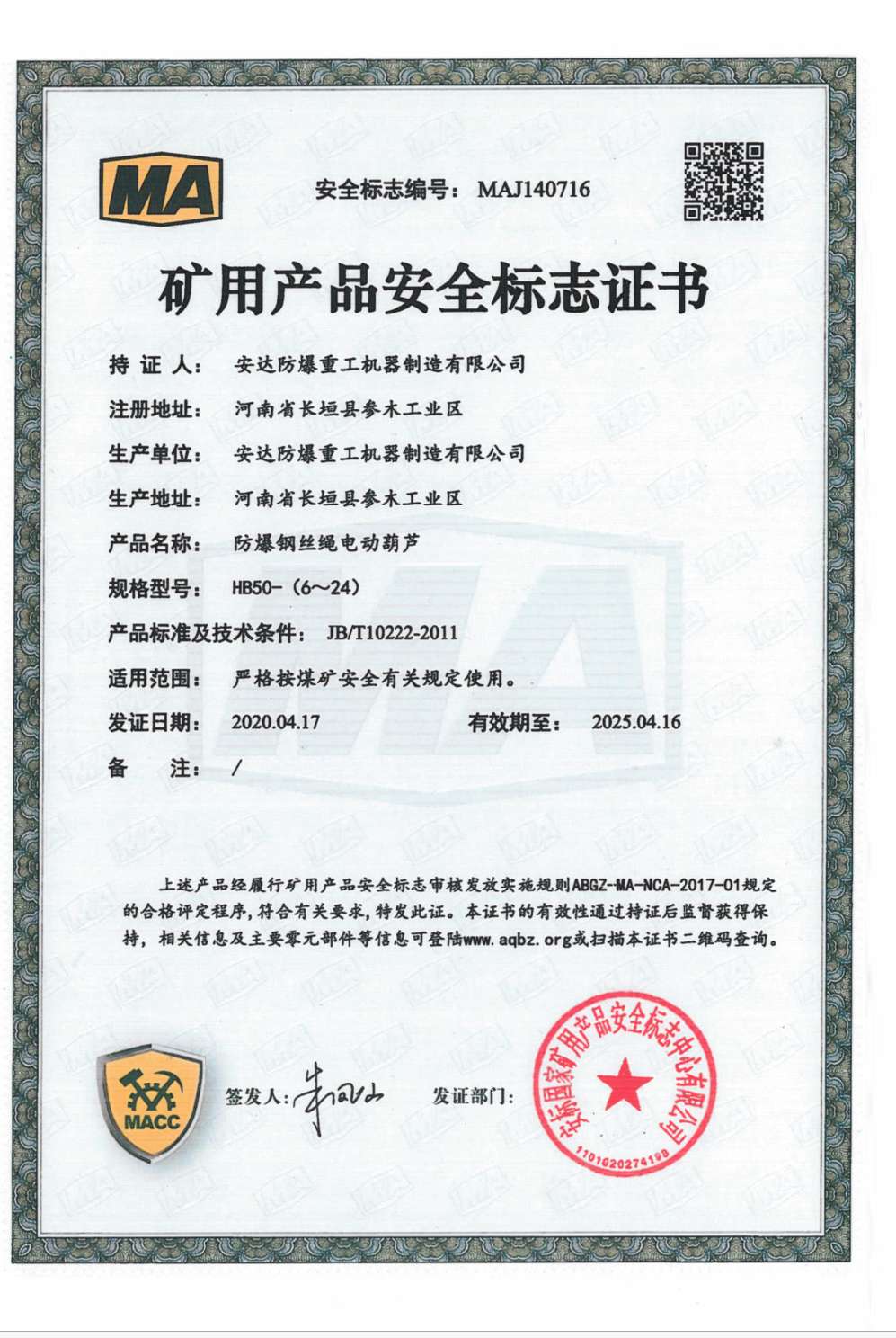 防爆鋼絲繩葫蘆橋式起重機 礦用產品安全標志證書