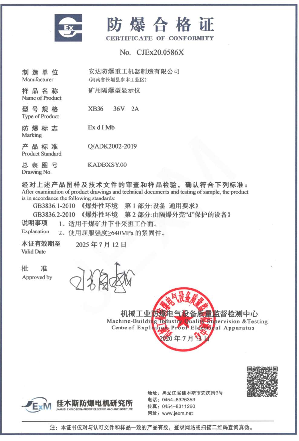 | 發(fā)證機(jī)構(gòu): | 機(jī)械工業(yè)防爆電氣質(zhì)量監(jiān)督檢測(cè)中心 | 發(fā)證時(shí)間 : | 2020-07-13 |