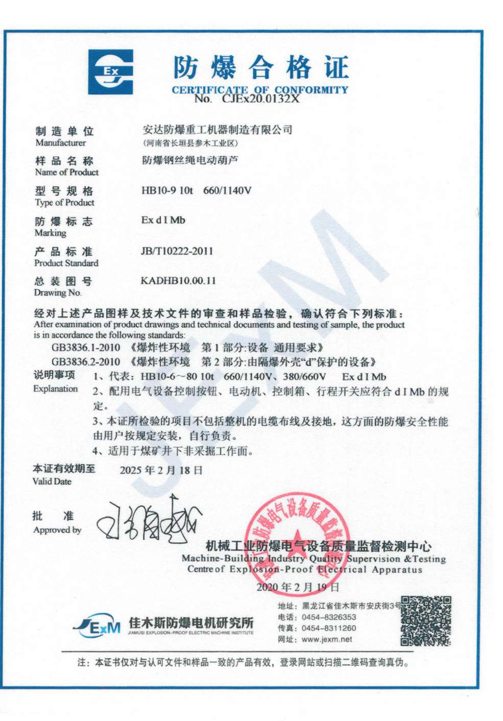 | 發(fā)證機(jī)構(gòu): | 機(jī)械工業(yè)防爆電氣設(shè)備質(zhì)量監(jiān)督檢測中心 | 發(fā)證時(shí)間 : | 2020-02-19 |