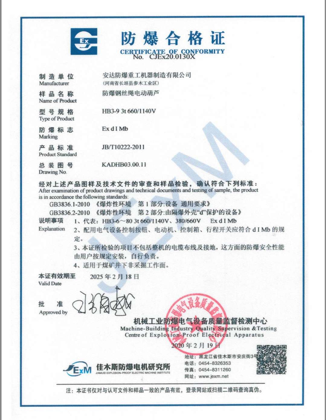 榮譽(yù)資質(zhì) 防爆鋼絲繩電動(dòng)葫蘆 防爆合格證