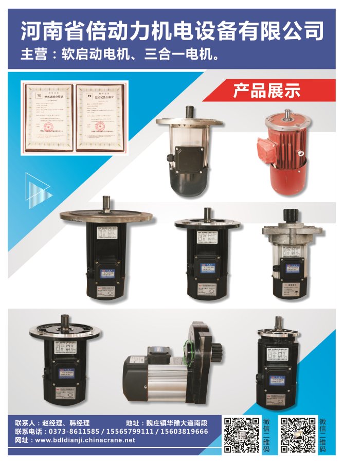 河南省倍動(dòng)力機(jī)電設(shè)備有限公司,專業(yè)生產(chǎn)軟啟動(dòng)電機(jī),三合一電機(jī)。配套橋門式起重機(jī),各種型號(hào)鋼絲繩電動(dòng)葫蘆。我們將以放心質(zhì)量,貼心的服務(wù),贏得廣大新老客戶的信賴。