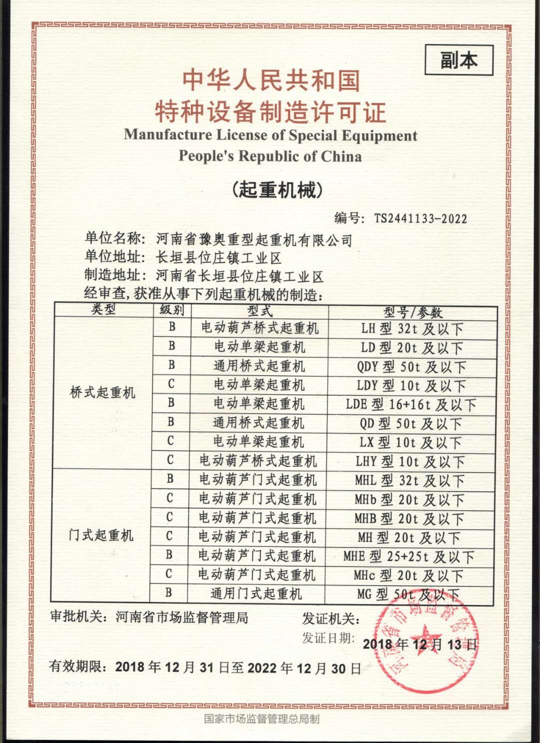 » 特種設備制造許可證