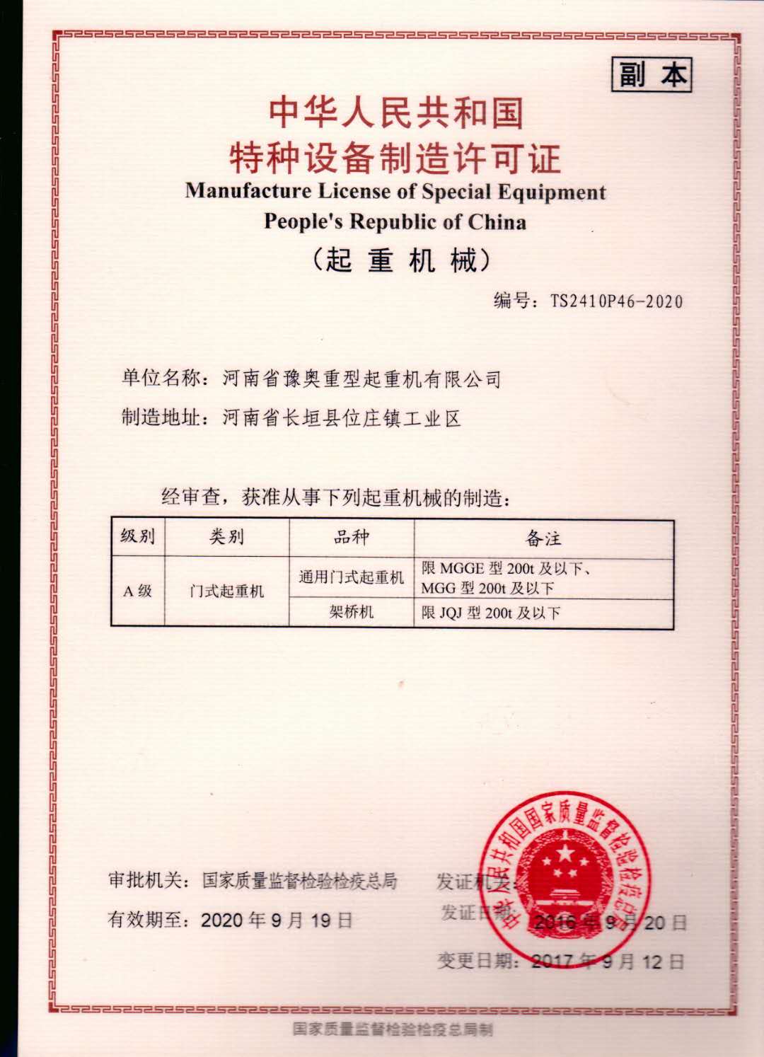 » 特種設備制造許可證