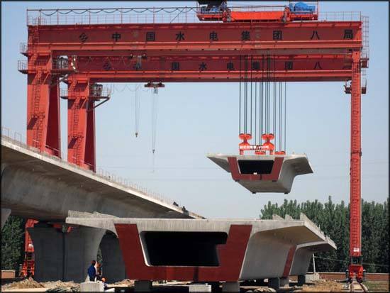 架橋機主要是架設橋梁用,吊運混凝土梁到指定的位置,用來調整方向,是靠四個支柱來完成支撐的。架橋機在公路架橋過程中,主要作用是把預制好的梁片運輸到橋墩上。而龍門吊則是把梁片從地面上提起來交給運梁車,再由運梁車把梁片運輸到架橋機下面。兩者是相互配合工作的。架橋機也分好幾個類型的,根據行走方式不同,有的架橋機是靠驅動輪行走,有的是導梁結構。提梁機則分為包廂結構和衍架結構,按照噸位的不同,小噸位采用電動葫蘆,大噸位采用起重小車。