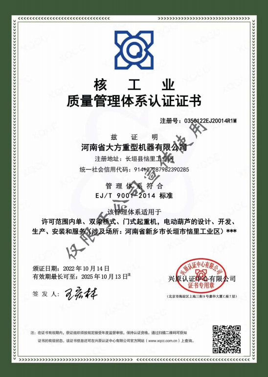 » 核工業質量管理體系認證證書