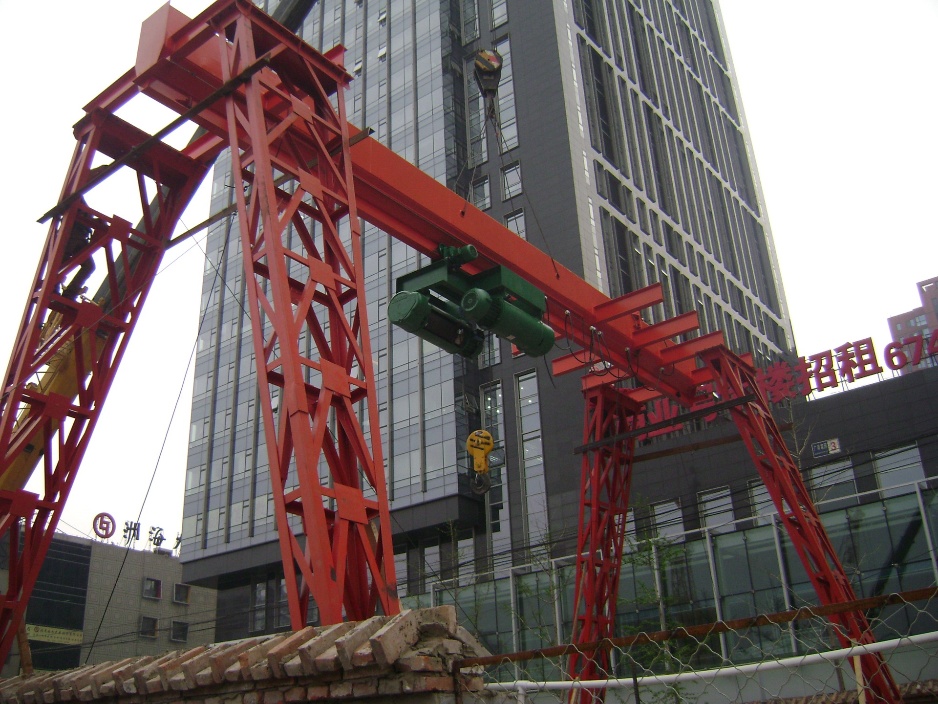 它的金屬結構像門形框架,承載主梁下安裝兩條支腳,可以直接在地面的軌道上行走,主梁兩端可以具有外伸懸臂梁。門式起重機(又稱龍門起重機)是橋架通過兩側支腿支撐在地面軌道上的橋架型起重機。在結構上由門架、大車運行機構、起重小車和電氣部分等組成。有的門式起重機只在一側有支腿,另一側支撐在廠房或棧橋上運行,稱作半門式起重機。門式起重機的門架上部橋架(含主梁和端梁)、支腿、下橫梁等部分構成。為了擴大起重機作業范圍,主梁可以向一側或兩側伸出支腿以外,形成懸臂。也可采用帶臂架的起重小車,通過臂架的俯仰和旋轉擴大起重機作業范圍。
