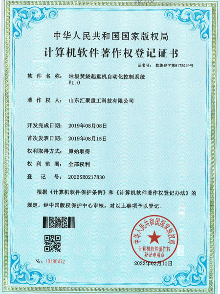 垃圾焚燒起重機自動化控制系統 V1.0(自動化證書)