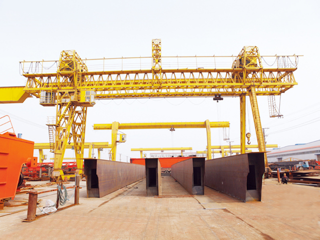 該門式起重機(jī)其主要用于橋梁建設(shè),工作速度慢,由門架、卷揚(yáng)機(jī)小車、大車運(yùn)行機(jī)構(gòu)、司機(jī)室和電氣控制系統(tǒng)組成。門架為桁架結(jié)構(gòu),具有結(jié)構(gòu)輕、抗風(fēng)力強(qiáng)等優(yōu)點(diǎn)。包括主梁、上端梁、支腿、下端梁、走行臺車及走臺欄桿等。主梁采用三角桁架結(jié)構(gòu),上面鋪設(shè)有軌道,供小車沿主梁方向作橫向移動。支腿采用箱形或鋼管兩種形式。小車上布置有卷揚(yáng)機(jī),體積緊湊,自重輕。