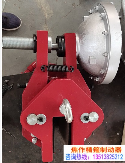 1、氣缸, 2、右制動臂 3、復(fù)位彈簧 5、活塞桿 6、調(diào)整桿 7、螺母 8、左制動臂 9、基座 10、制動塊11、彈簧鋼絲 12、摩擦片