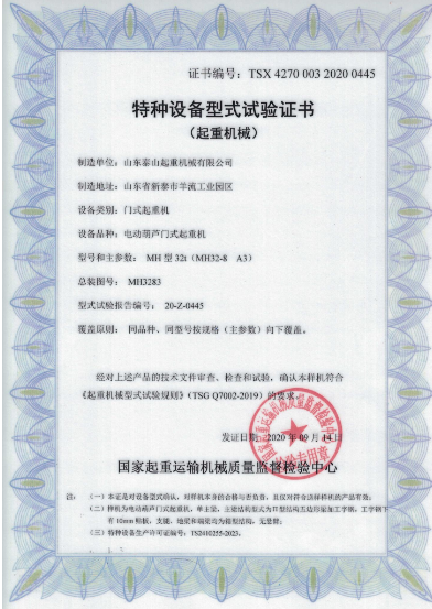 榮譽(yù)資質(zhì) 電動葫蘆門式起重機(jī)