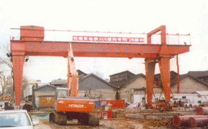 門式起重機是橋式起重機的一種變形,又叫龍門吊。主要用于室外的貨場、料場貨、散貨的裝卸作業。它的金屬結構像門形框架,承載主梁下安裝兩條支腳,可以直接在地面的軌道上行走,主梁兩端可以具有外伸懸臂梁。門式起重機具有場地利用率高、作業范圍大、適應面廣、通用性強等特點,在港口貨場得到廣泛使用。
