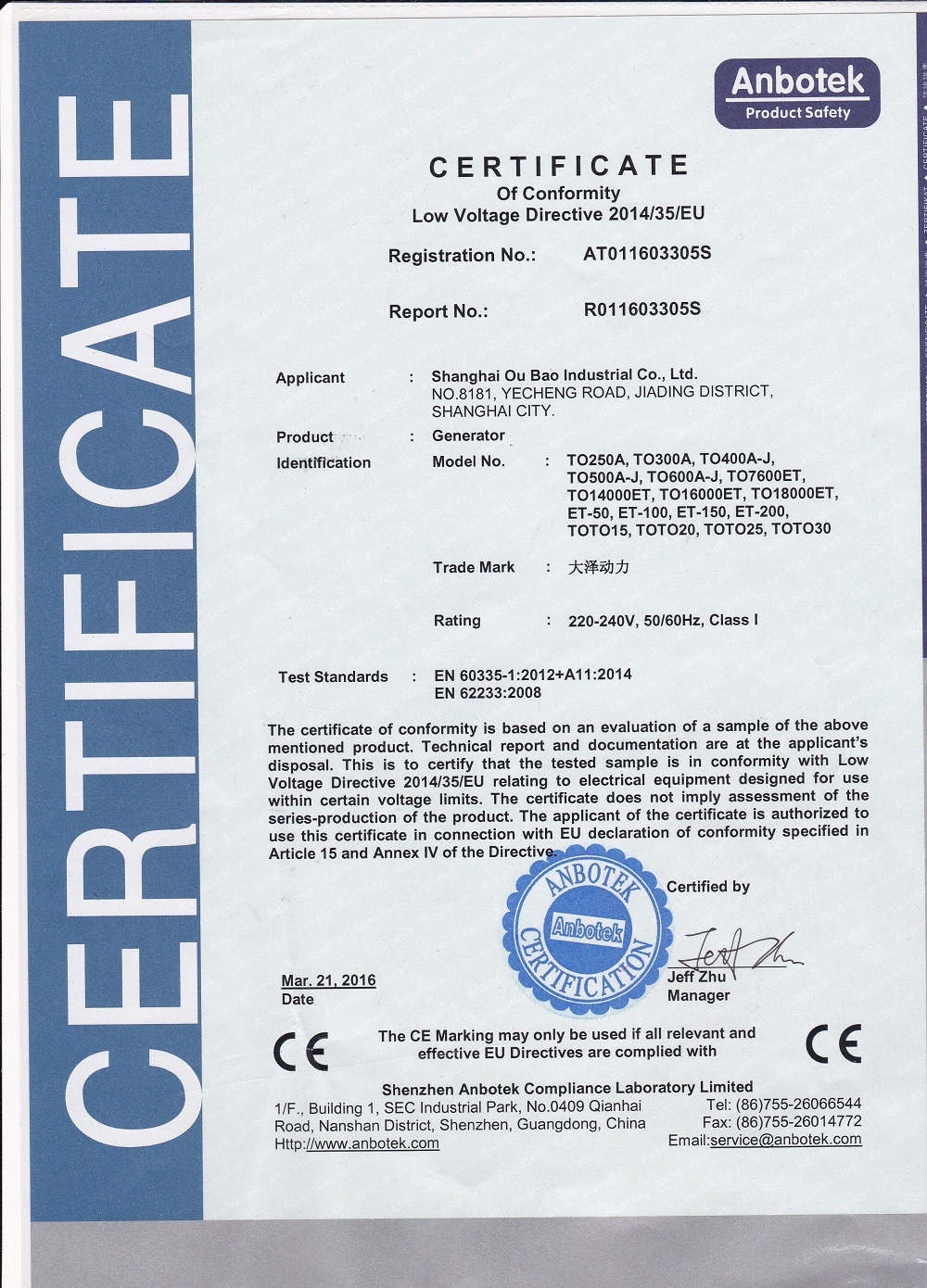 大澤動力發電機擁有CE歐盟安全認證