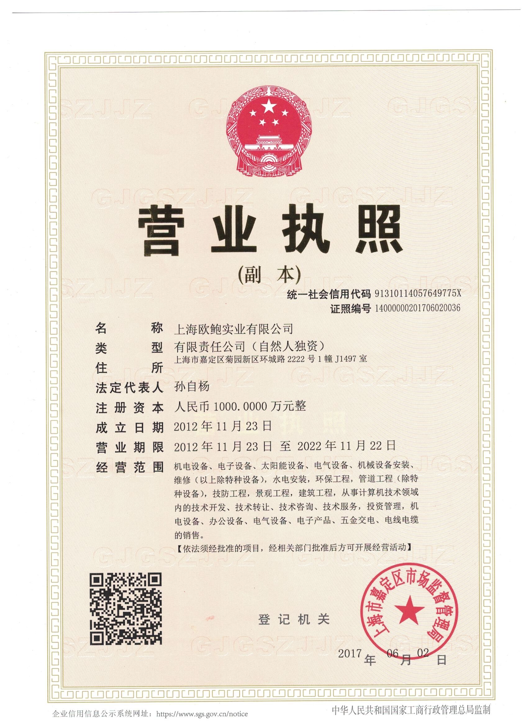 | 發(fā)證機(jī)構(gòu): | 上海市嘉定區(qū)市場(chǎng)監(jiān)督管理局 | 發(fā)證時(shí)間 : | 2012-11-23 |