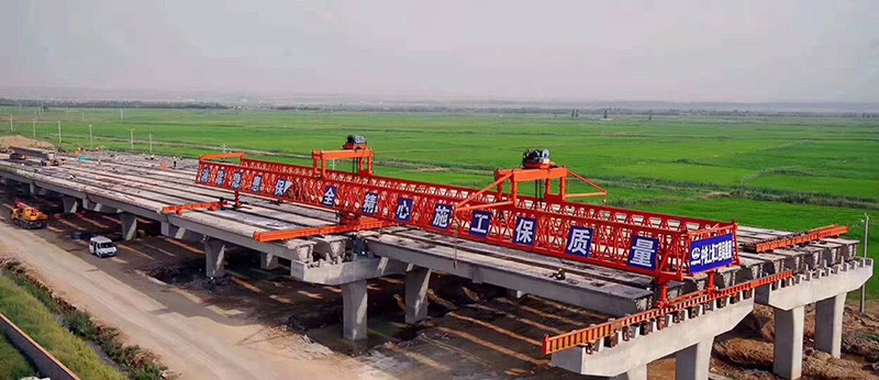 紅旗型架橋機和燎原型架橋機屬此類,吊重也是130噸。其吊臂是由左右兩條箱梁組成,兩梁貫通機身并向前后端伸出。在兩端都有各由兩腿桿組成的折疊立柱。紅旗型兩梁的中距為3.4米,燎原型的則為4.8米。橫跨兩條箱梁有兩臺桁車,能沿吊臂縱向行駛。吊梁小車置于桁車上,能沿桁車橫向行駛。待架的梁片(或整梁)可用鐵路平板車直接送到架橋機的后臂之下,用吊梁小車起吊后,憑桁車前移,再以吊梁小車橫移,然后落梁**位。這類架橋機的前后端都可吊梁及落梁;改變架梁方向時,不需要調頭;為適應曲線架梁,前后臂都可在水平面內擺動;分片架設時不必移梁或撥道,梁即可**位;“喂梁”也不需要橋頭岔線或特制運梁車。