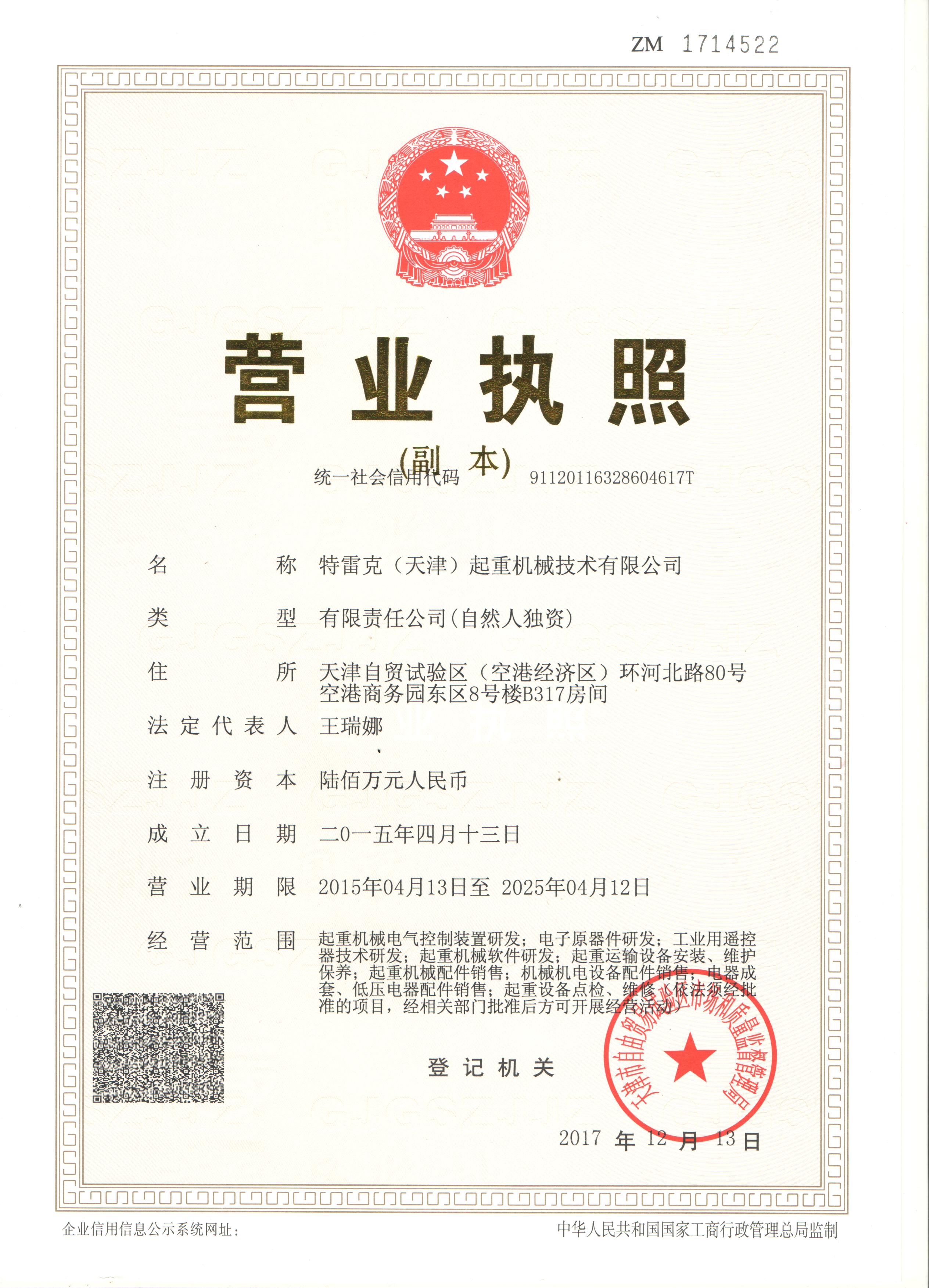 證書介紹 2015年特雷克(天津)起重機械技術有限公司正式成立,主營起重機械電氣控制裝置研發(fā),電子元器件研發(fā),工業(yè)用遙控器技術研發(fā),起重機械軟件研發(fā),起重運輸設備安裝,維修和保養(yǎng),起重機械配件銷售,機械機電設備配件銷售,電器成套,低壓電器配件銷售,起重設備點檢維修等經(jīng)相關部門批準可開展經(jīng)營**。