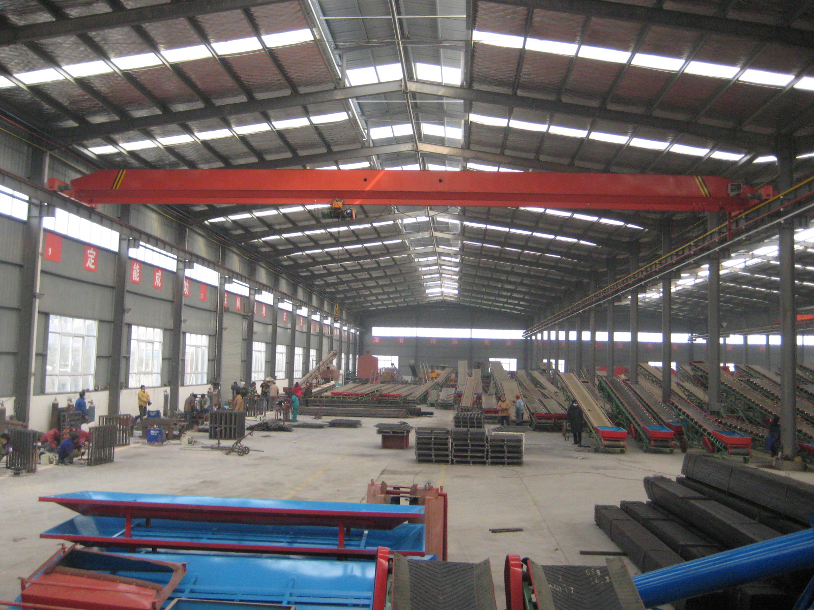 “橋式起重機是橫架于車間、倉庫和料場上空進行物料吊運的起重設備。由于它的兩端坐落在高大的水泥柱或者金屬支架上,形狀似橋。橋式起重機的橋架沿鋪設在兩側高架上的軌道縱向運行,可以充分利用橋架下面的空間吊運物料,不受地面設備的阻礙。它是使用范圍**廣、數量**多的一種起重機械。