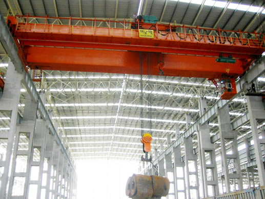 “橋式起重機是橫架于車間、倉庫和料場上空進行物料吊運的起重設備。由于它的兩端坐落在高大的水泥柱或者金屬支架上,形狀似橋。橋式起重機的橋架沿鋪設在兩側高架上的軌道縱向運行,可以充分利用橋架下面的空間吊運物料,不受地面設備的阻礙。它是使用范圍**廣、數量**多的一種起重機械。
