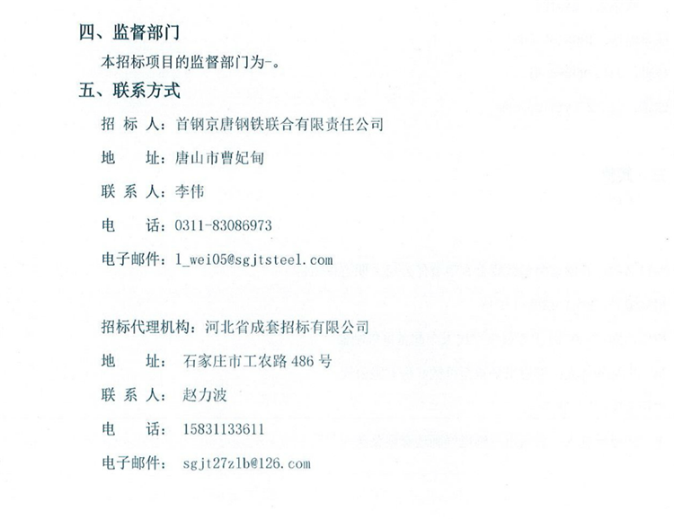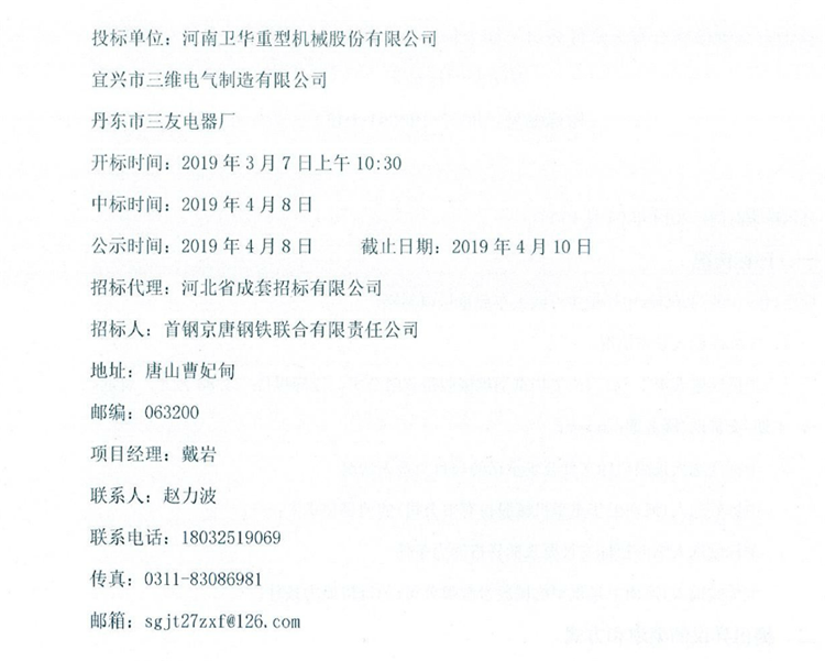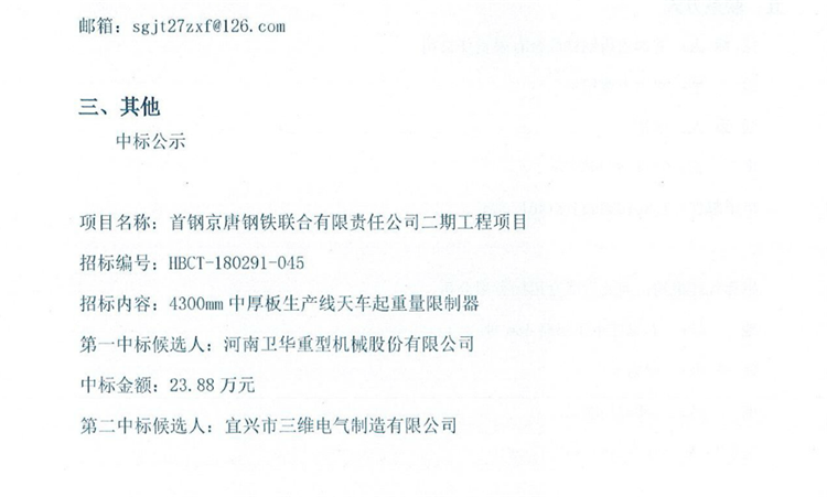 首鋼京唐鋼鐵聯合有限責任公司二期工程項目4300mm中厚板生產線天車起重量限制器中標公示