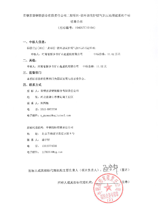 首鋼京唐鋼鐵聯合有限責任公司二期項目-能環部高爐煤氣加壓站用起重機中標結果公示