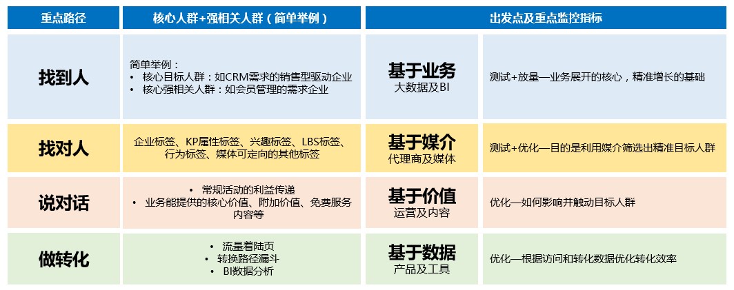 也是上一篇文章中問的問題,目標用戶是哪些?比如職業培訓行業有職業培訓需求的職場人士、電商行業是有購物需求的愛美的女士(以前有一個好玩的營銷心理的說法:老人要健康,兒童要聰明,女人愛美,男人好色),如果業務模式對應的人群比較清晰,找到人相對容易一點,如果目標人群的屬性相對比較復雜,或者像B2B企業目標人群的決策鏈比較長,就需要對業務更多的了解才能有比較清晰的人群方向。