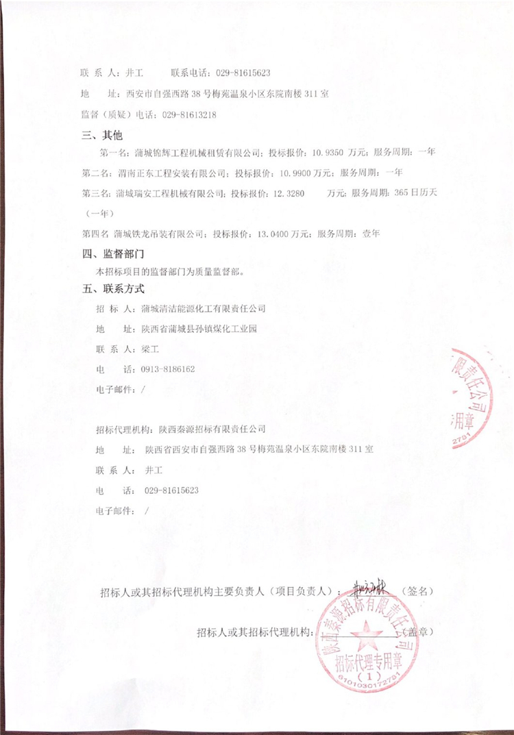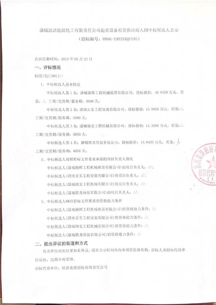 移動版:蒲城清潔能源化工有限責任公司起重設備租賃供應商入圍中標候選人公示