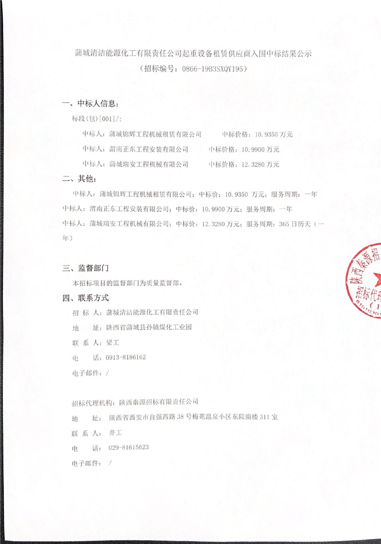 蒲城清潔能源化工有限責任公司起重設備租賃供應商入圍中標結果公示