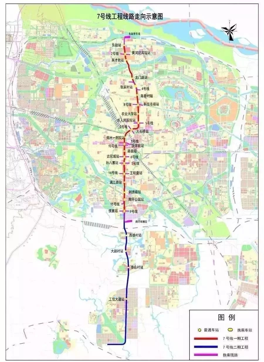 7號線一期自東趙站至侯寨站,線路長 26.9 公里,設車站20 座,從北四環沿文化路、大學路、大學南路走向。