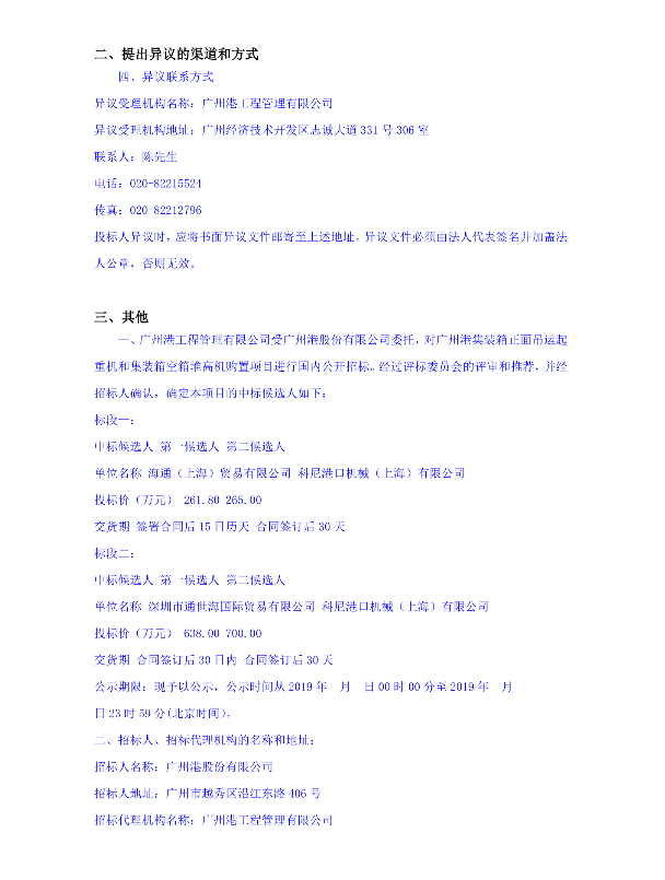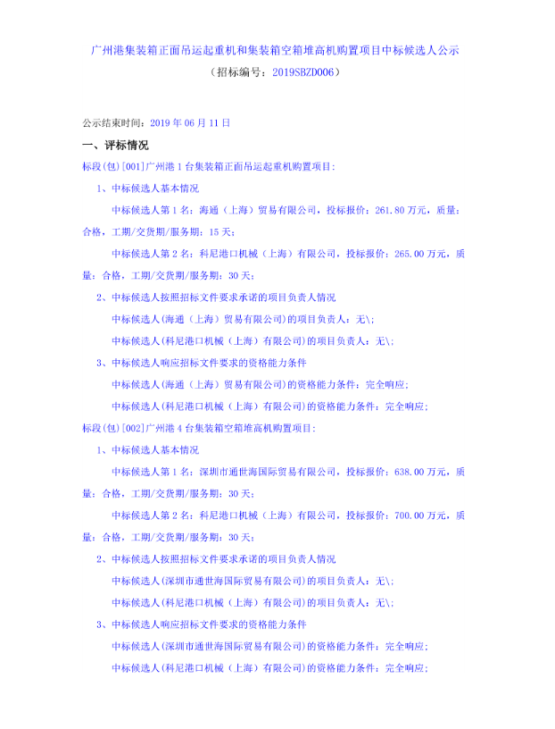廣州港集裝箱正面吊運起重機和集裝箱空箱堆高機購置項目中標候選人公示