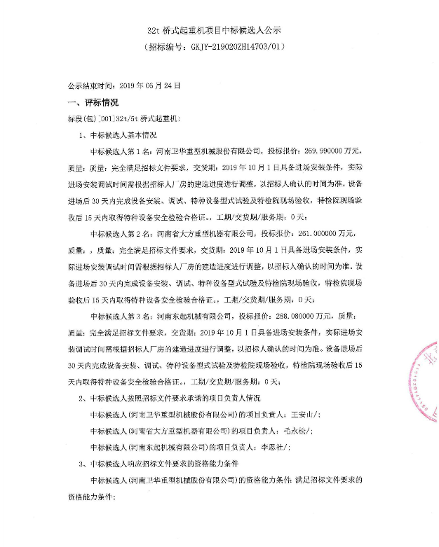 移動版:32t橋式起重機項目中標候選人公示