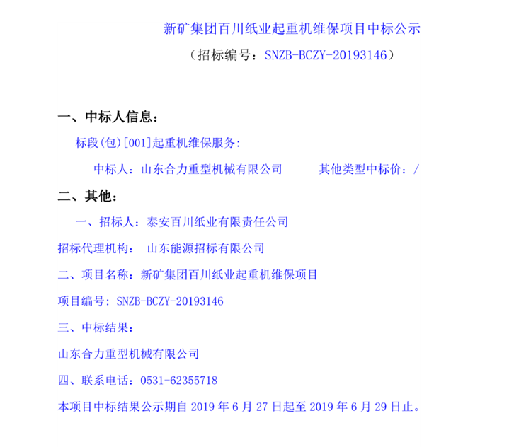 新礦集團百川紙業起重機維保項目中標公示