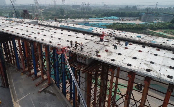 為提高橋梁混凝土質量,在全國大體積工程結構物施工中,首次采用強度為C60的自密實混凝土施工技術,經過反復檢測、試配,路橋公司分部于去年11月11日在七里河橋成功澆筑首個0號塊;一公司分部對航海東路橋10米高橋墩一次性澆筑337立方米混凝土,成為全國最大的C60自密實混凝土單體工程。從41.5米到60米,橋梁由單線轉雙線變截面處,采用盤扣式腳手支架,跨度為120米的東南四環立交橋,一次澆筑3842立方米混凝土現澆梁。