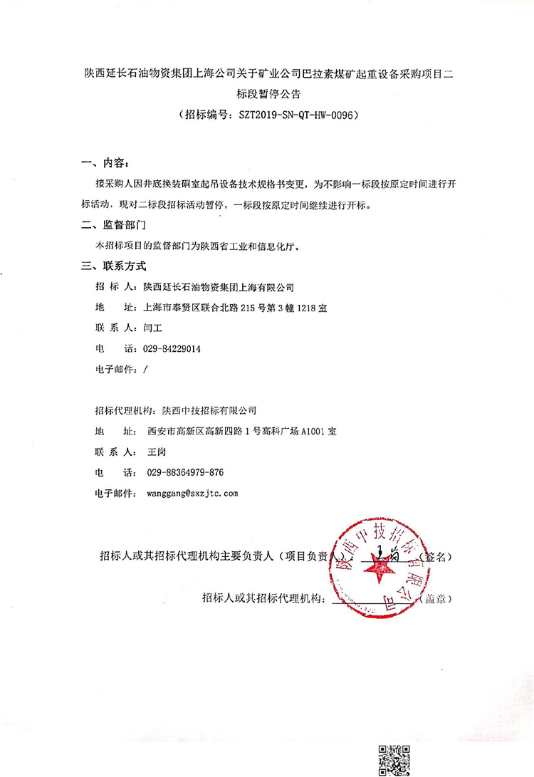 陜西延長石油物資集團上海公司關于礦業公司巴拉素煤礦起重設備采購項目二標段暫停公告