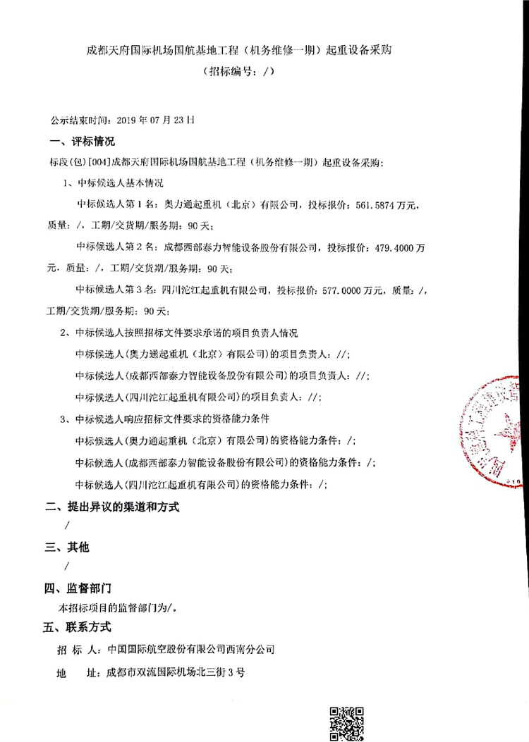 移動版:成都天府國際機場國航基地工程(機務維修一期)起重設備采購中標公告