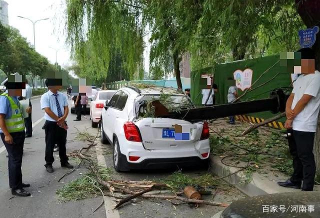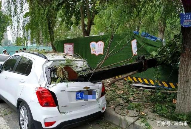 側(cè)翻的吊臂砸到了??吭诼愤呉惠v白色私家車轎車尾部,車損較為嚴(yán)重,汽車玻璃,樹枝等散落了一地。