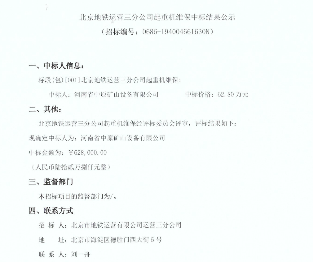 北京地鐵運營三分公司起重機維保中標結果公示