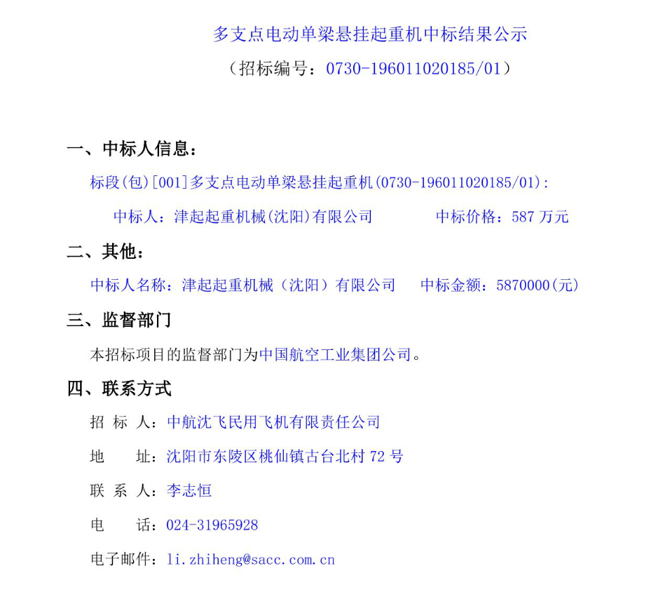 移動版:多支點電動單梁懸掛起重機中標結果公示