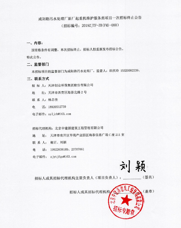咸陽路污水處理廠新廠起重機維護服務商項目一次招標終止