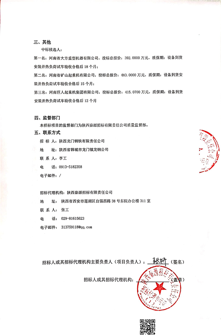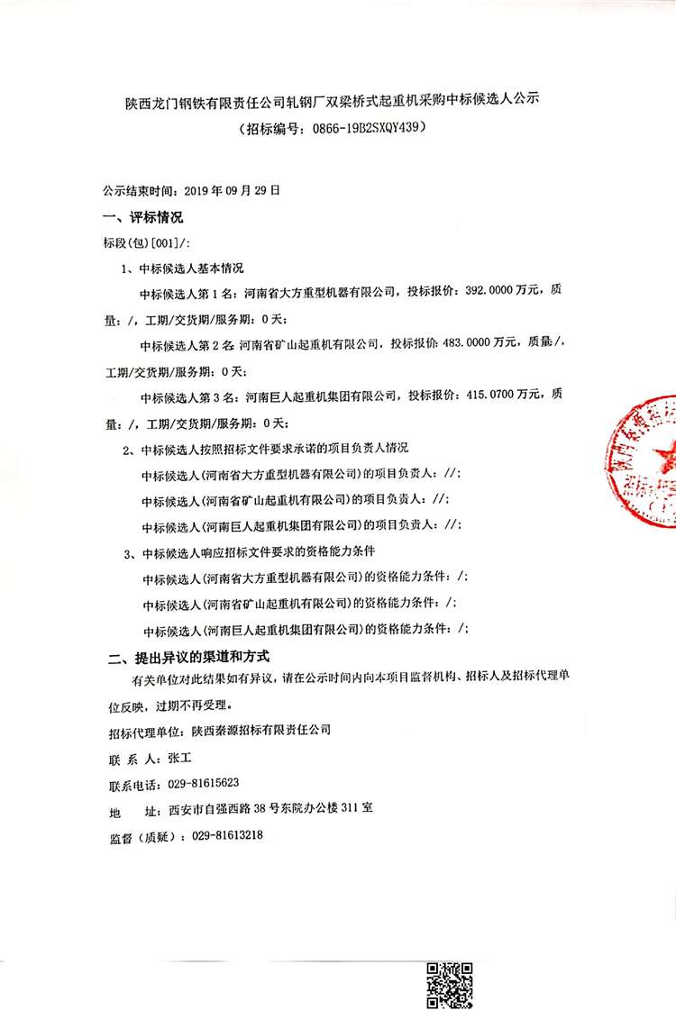 陜西龍門鋼鐵有限責(zé)任公司軋鋼廠雙梁橋式起重機采購中標(biāo)候選人公示