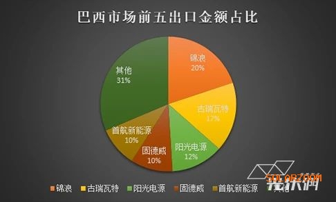 巴西市場主要的并網逆變器出口廠家包括錦浪、古瑞瓦特、陽光電源、固德威、首航新能源、華為等。按照出口金額統計各家占比份額如下: