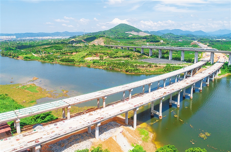 6月30日,山海高速全長456.4米的南田藤橋東河大橋,正在進行橋面施工。