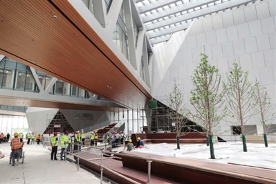 走進(jìn)天津茱莉亞學(xué)院項(xiàng)目,現(xiàn)場呈現(xiàn)出一片繁忙的施工景象。各參建單位正有序進(jìn)行幕墻、精裝、機(jī)電安裝、普裝工程收尾及園林景觀石材鋪貼施工等工作。項(xiàng)目內(nèi)4個(gè)聲學(xué)要求最高的單體項(xiàng)目中,黑盒劇場精裝修已基本完成。目前,現(xiàn)場施工人員921人,正在緊密圍繞8月份完成竣工驗(yàn)收備案、9月份順利開學(xué)的目標(biāo)全力以赴,加班加點(diǎn)追趕工期。