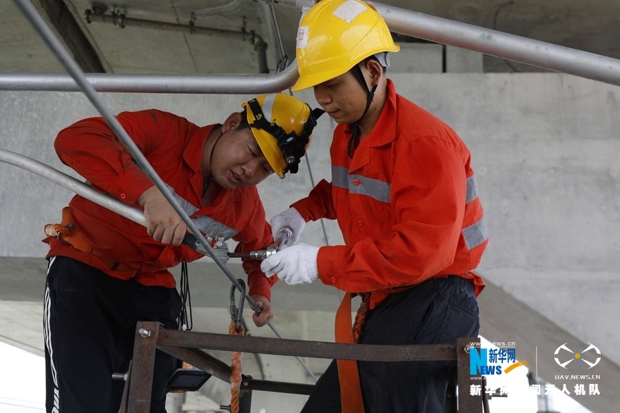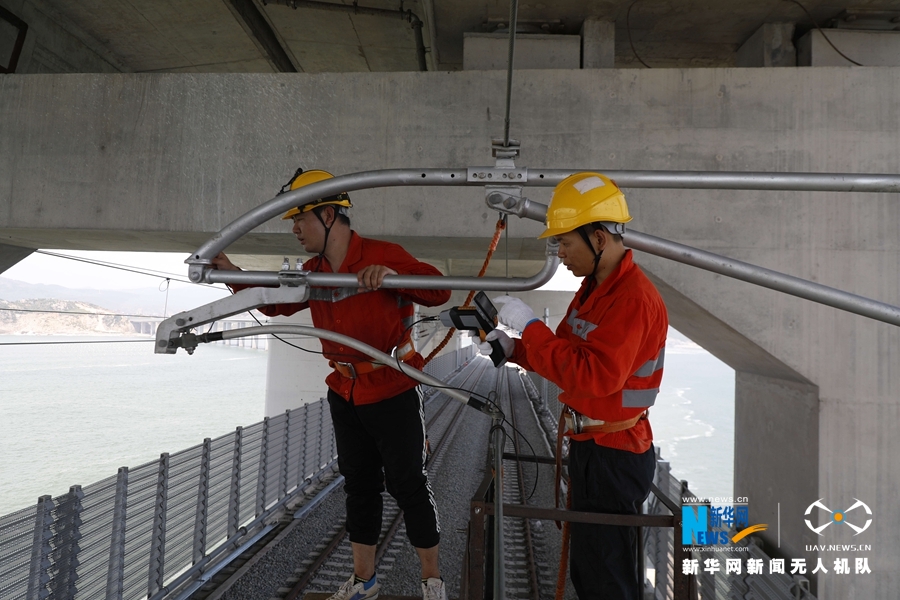 十幾名接觸網工在檢查大橋上的接觸網供電設備。新華網發(胡鵬 攝)
