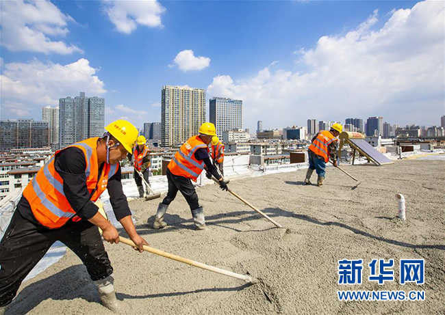 9月11日,工人在太原老軍營小區施工。新華社發(武將 攝)